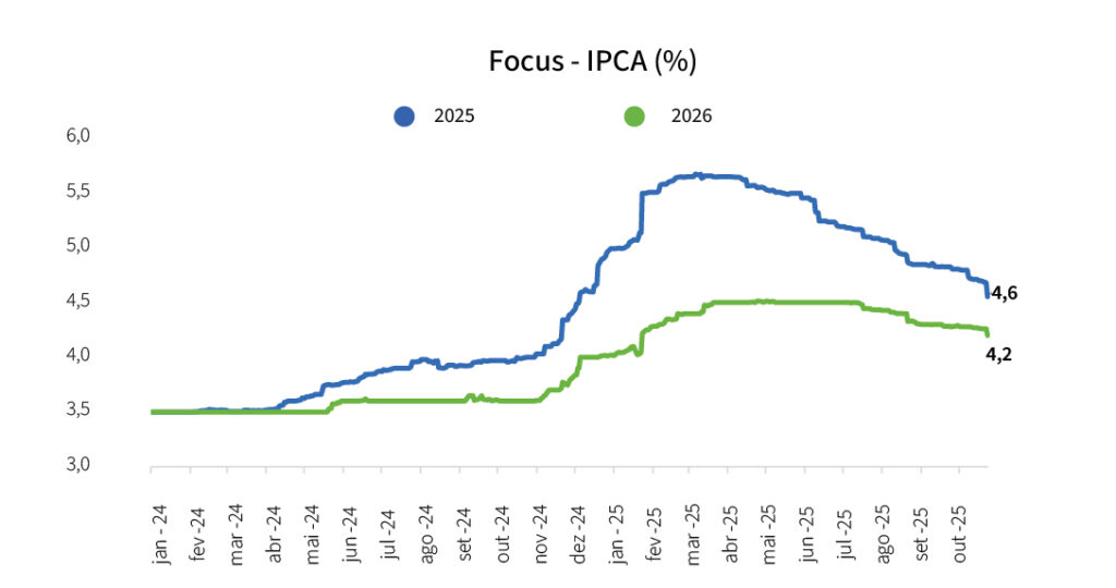 Mas, felizmente, a inflação cedeu. Na verdade, as expetativas para a inflação já vinham cedendo, como se pode ver no gráfico, de tal sorte a aproximar as taxas esperadas para 2025 e 2026 do limite superior de tolerância para o IPCA (4,5%):